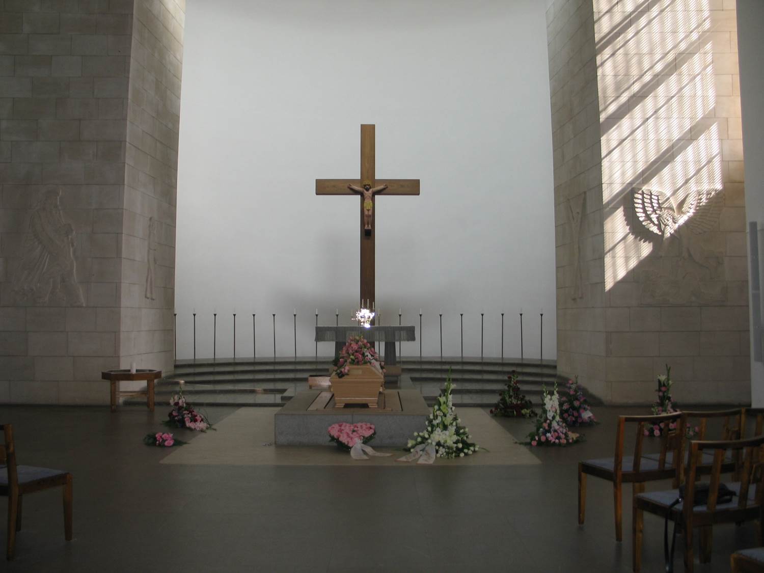 Samme konstnär, Bror Hjorth, har också utfört de mäktiga kalkstensrelieferna på murarna på ömse sidor om altaret. Kristus sluter den befriade människosjälen i sin famn. En ängel med tunga vingslag sänker sig mot en människa. Tyra Lundgren har smyckat väntrummet intill Uppståndelsens kapell med sin skapelse Livets rikedom.