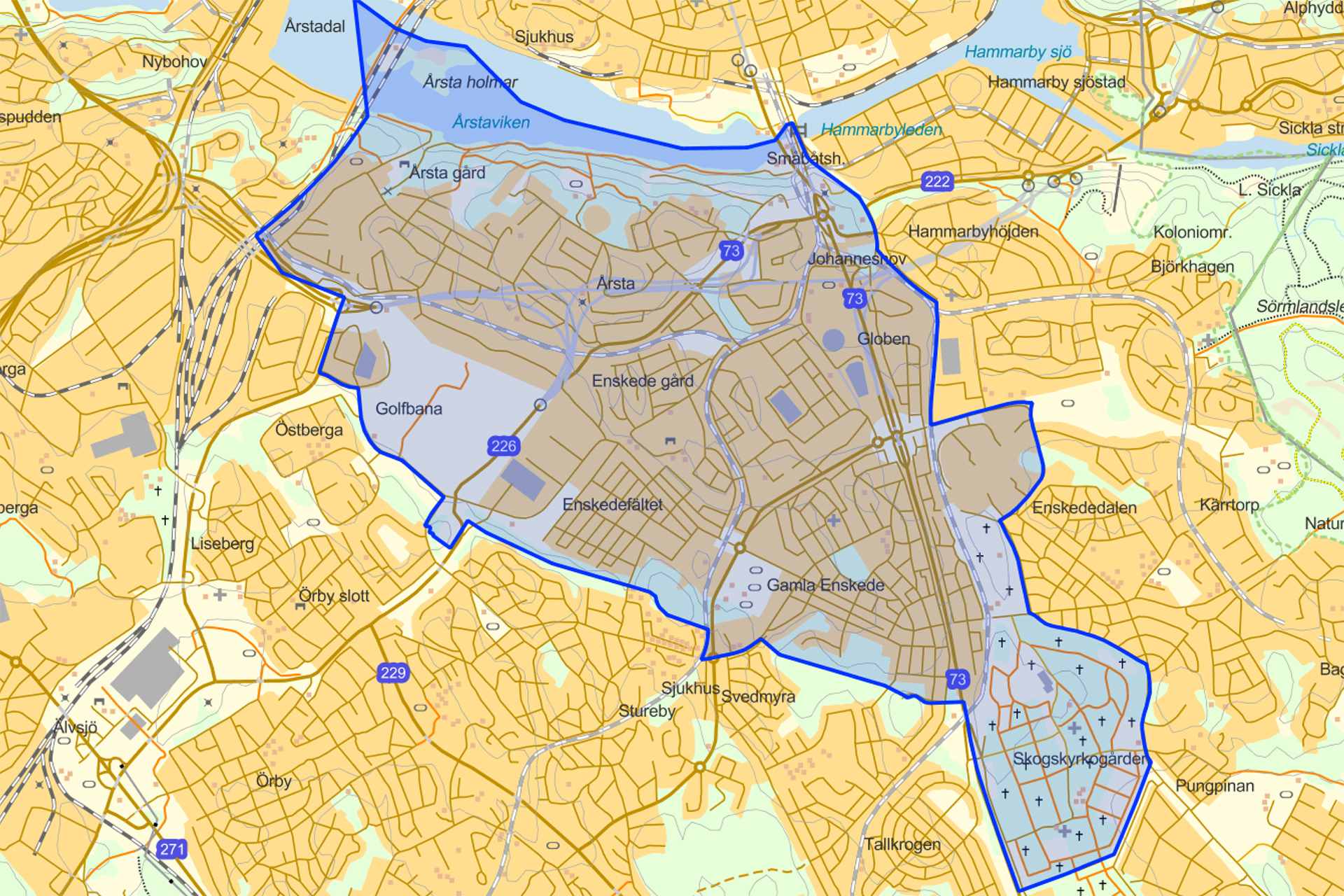 Inom församlingen ligger bland annat Globen, Tele2 Arena och Skogskyrkogården. I vårt område finns även en Equmeniakyrka (Triangelkyrkan) och en Serbisk Ortodox kyrka.
