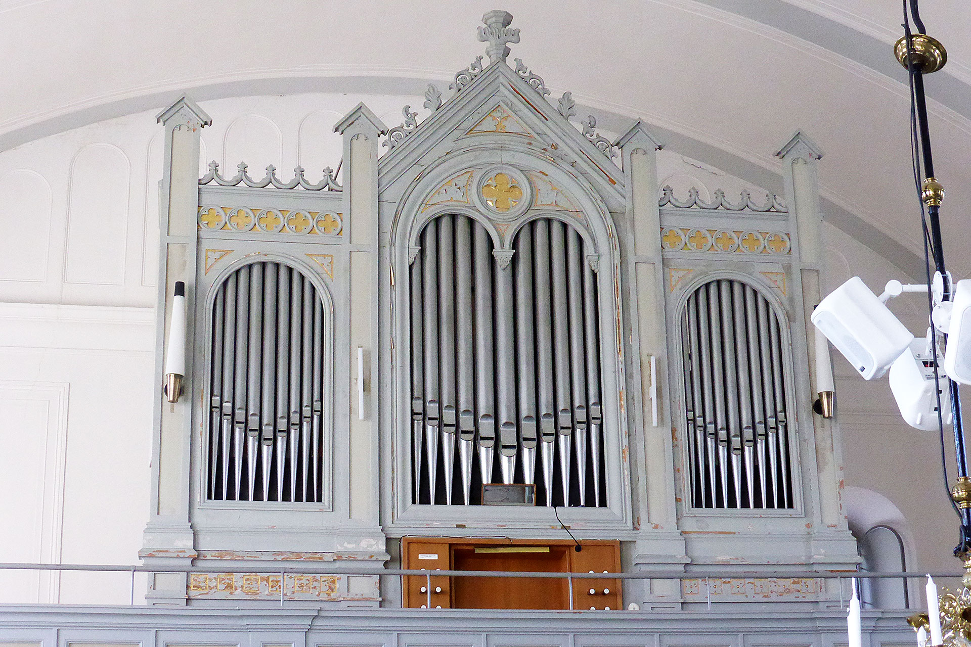 Fasad från den föregående orgeln, vilken var byggd 1861 av Sven Fogelberg. Samtida med kyrkan i tidig nygotik (ursprungligen stum fasad enligt SAOK 1957).