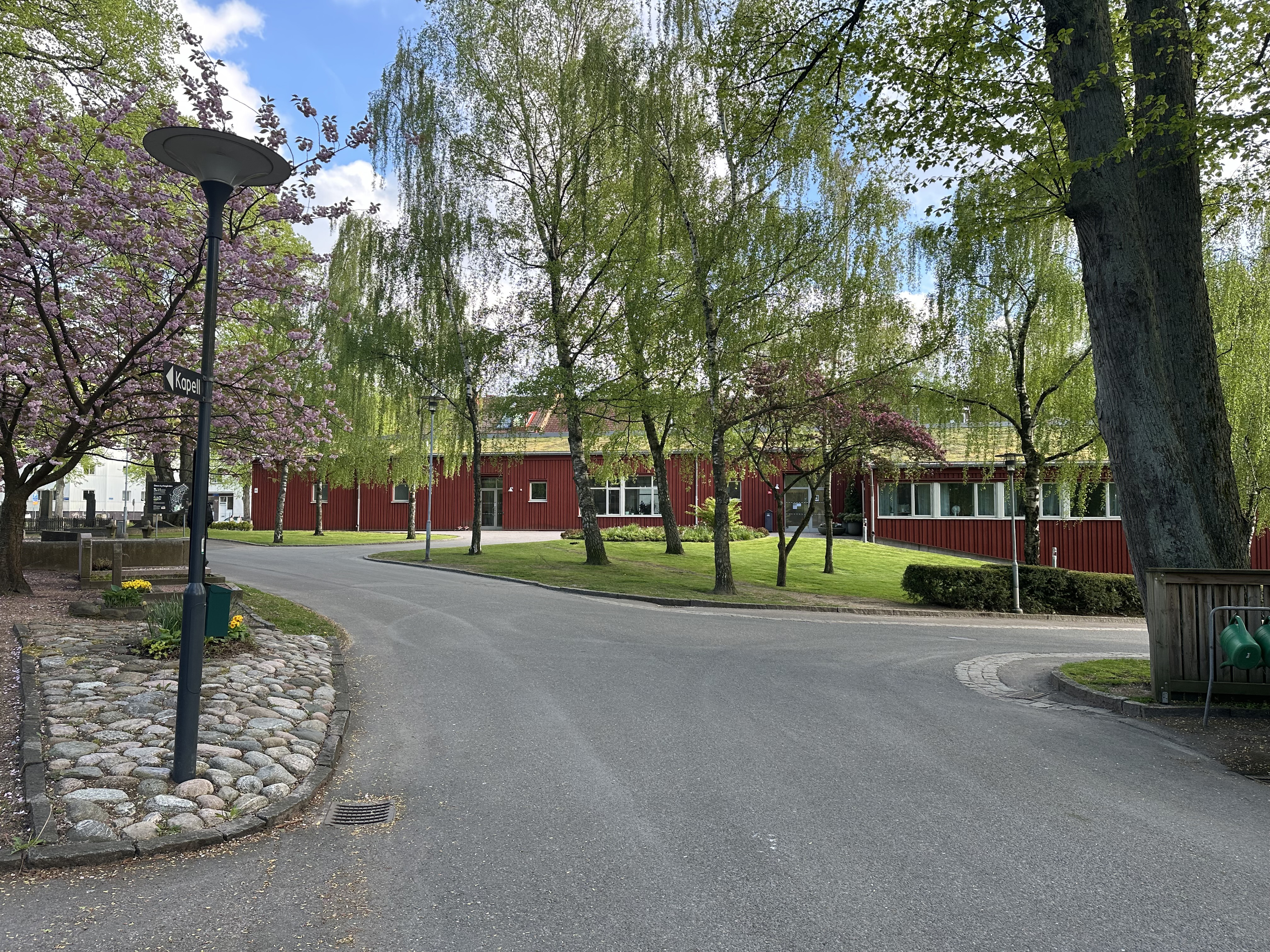 Innan dess stod en gammal personalbyggnad på samma plats och den nya byggnaden tar upp ungefär samma yta som det gamla huset. Exteriören är utformad för att smälta in i kyrkogården så mycket som möjligt, med sedumtak och rödmålad fasad. Och för att fasaden inte ska bli för repetitiv är lockbrädorna olika breda. Arkitekten inspirerades av begravningsplatsens grönska, så färgtemat inomhus går i olika nyanser av grönt.