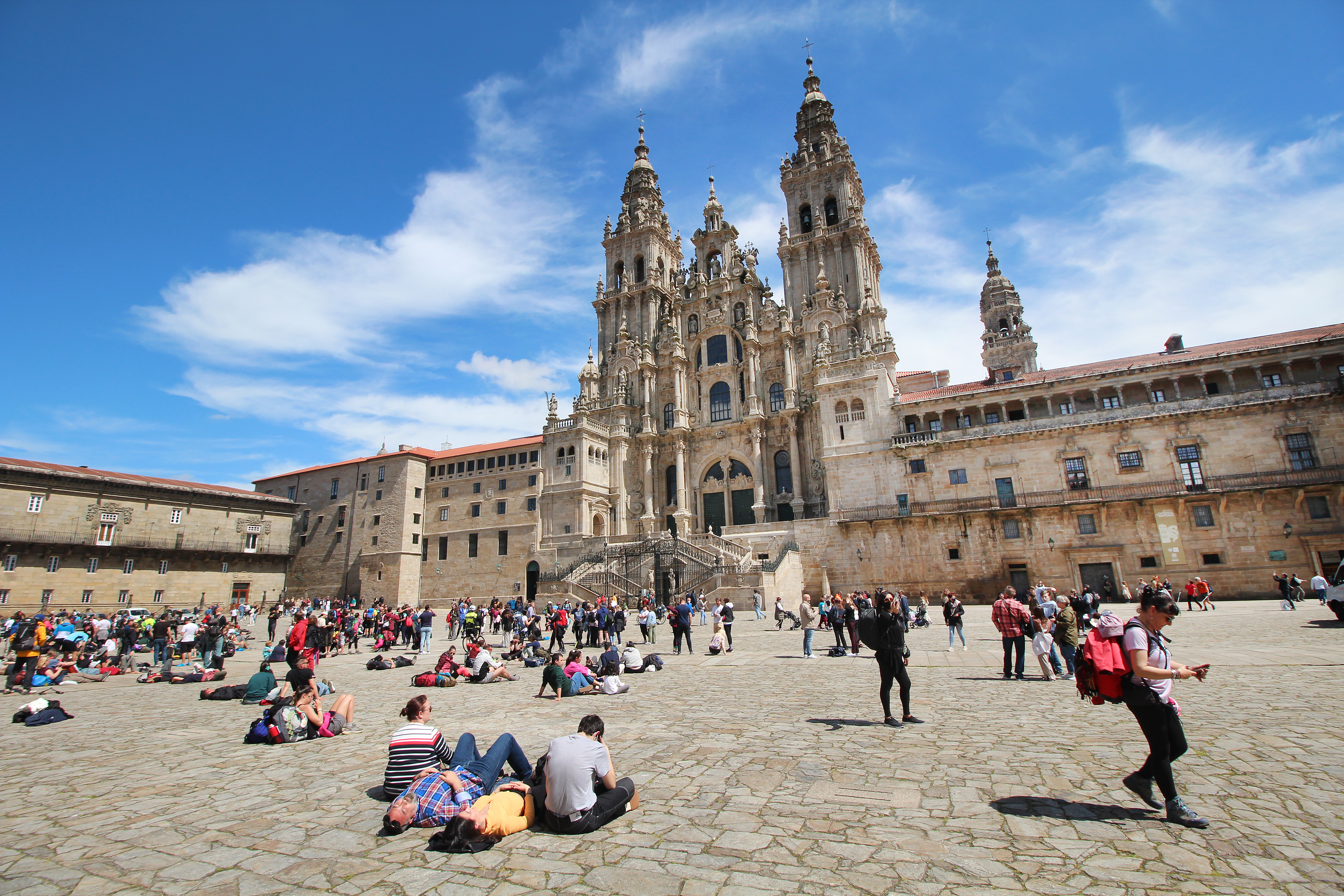 När vi når fram till den öppna platsen framför katedralen är det fullt med människor. Många turister, som vi, men också pilgrimer som nått fram till sitt mål. En flicka ligger på rygg, med ryggsäcken under nacken och blickar upp mot katedralen, äntligen framme! Alla tar bilder.