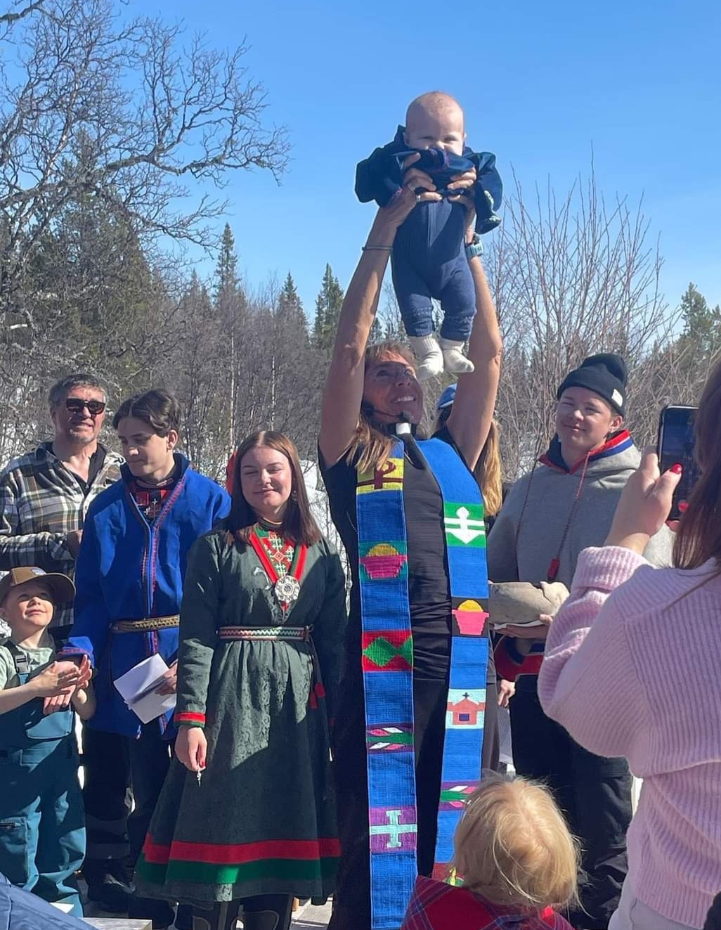 Dopet är en helig handling. Barnet bär med sig dopets välsignelse till hemmet och familjen. Dopvattnet hanteras varsamt och hämtas ofta av dopfamiljen själv från en fjällsjö eller källa. Vid dopgudstjänstens slut bärs dopvattnet ut ur kyrkan för att ges tillbaka till skapelsen. Samtidigt som vattnet hälls ut vid till exempel en fjällbjörk, kan en bön bedjas i den treenige Gudens namn. Barnet får också traditionsenligt ett samiskt dopsmycke i form av en komsekula med ett kors i present från kyrkan. Det är inte ovanligt att dopbarnet får många dopfaddrar, det är viktigt att stärka banden mellan släkter och generationer.