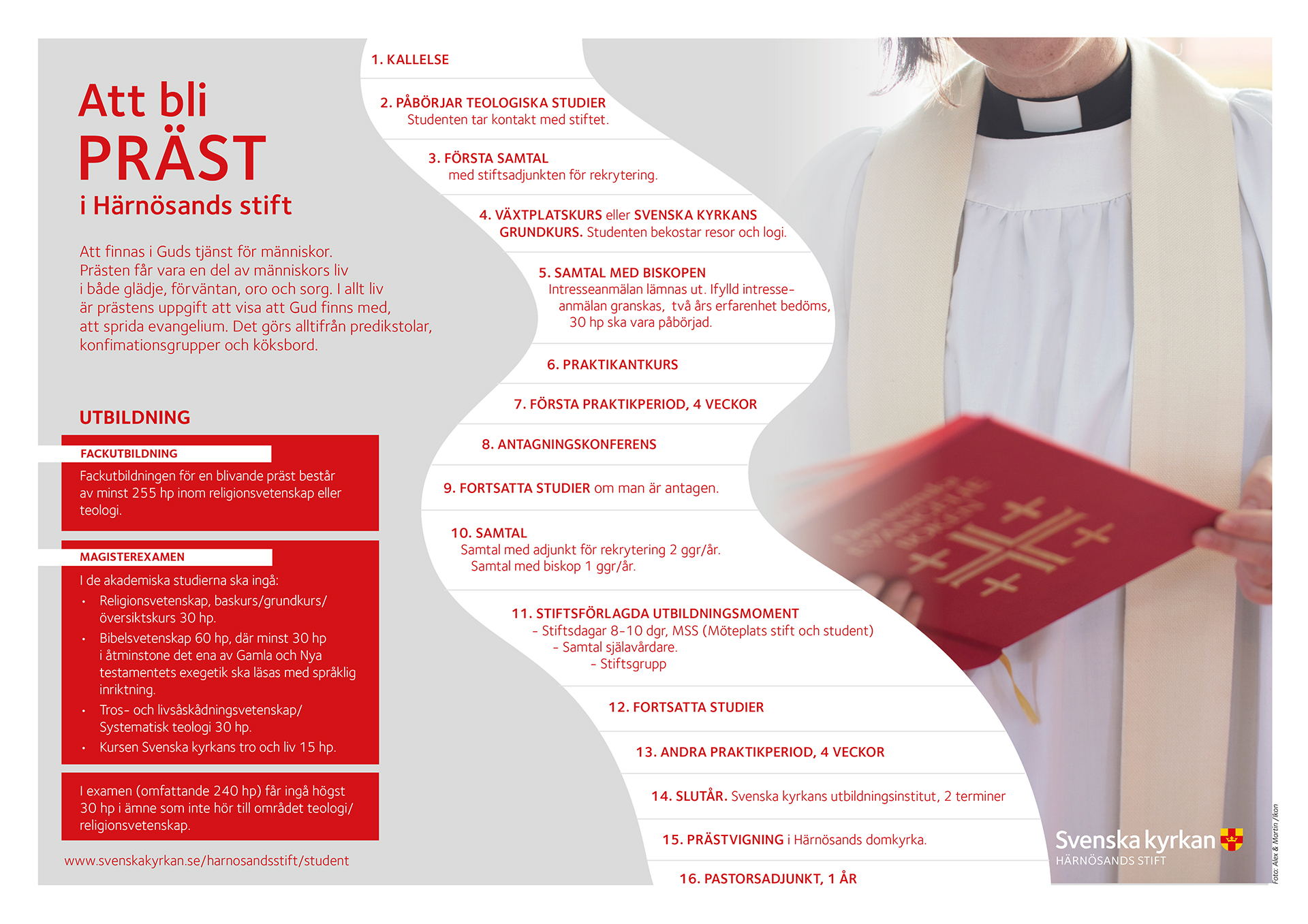 I kyrkan brukar vi beskriva de funderingarna och den längtan som en kallelse. Den kallelsen som du bär på kan kallas för den ”inre” kallelsen. När du känner på det sättet så ta kontakt med den på Härnösands stiftskansli som jobbar just med rekrytering av präster. Du hittar kontaktuppgifterna på baksidan av den här foldern. Ni kommer överens om en tid då ni träffas så att du får veta mer om en eventuell väg till prästyrket.