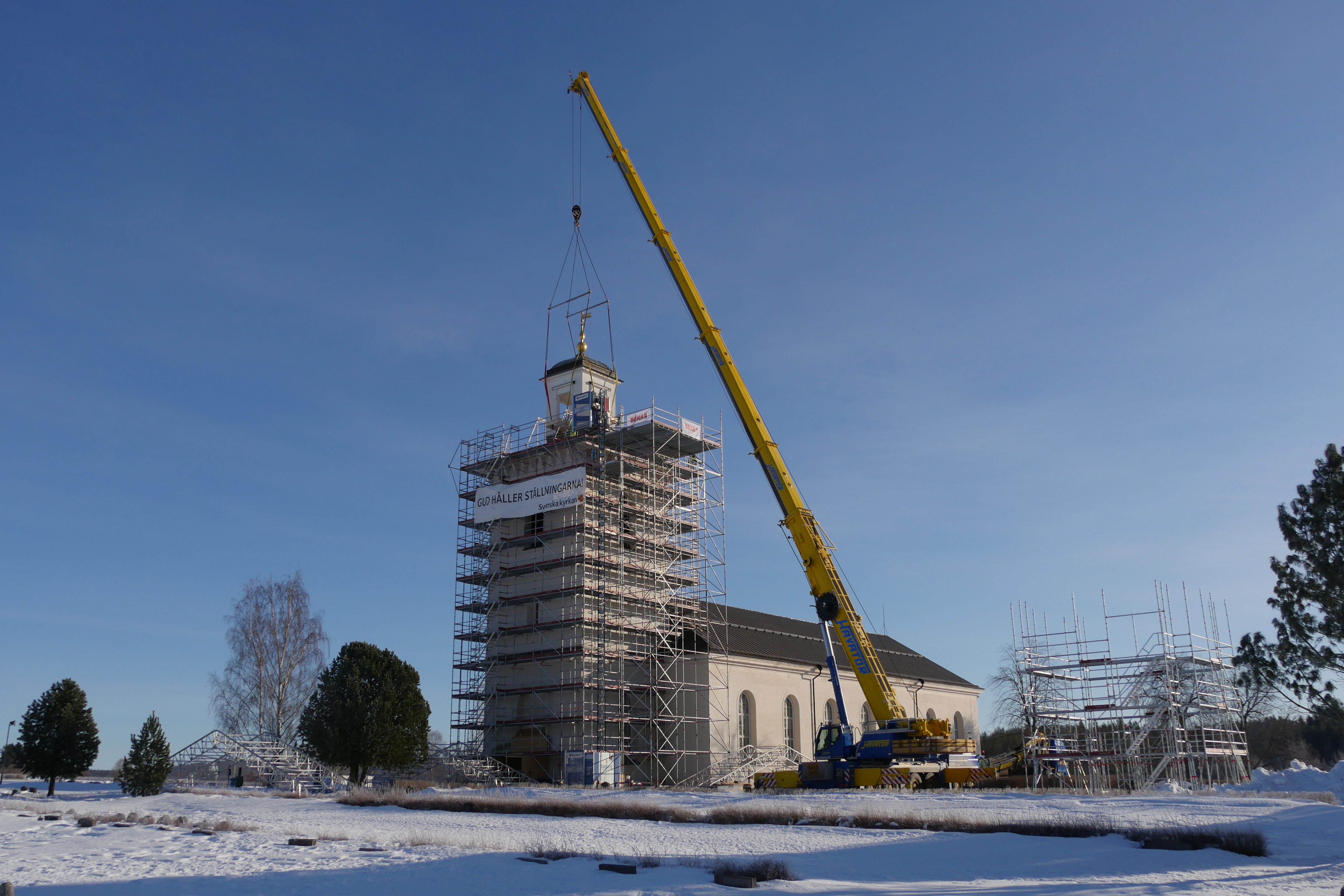 Processen med nedlyftet flöt på smidigt. Tornets topp hann dingla i luften blott några få minuter innan den nådde mark. Med precission sänkte kranföraren lanternin ner i mitten av ställningsmontaget på marken. Där ska den kläs in för att väderskyddas, under det att arbetet med reparation pågår. Toppen av kyrktornet som nu får ett stort hål upptill ska även det täckas.