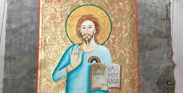 Mats Hermansson, präst och konstnär, visar egna presenningsikoner och bilder av den filippinske konstnären Emanuel Garibay