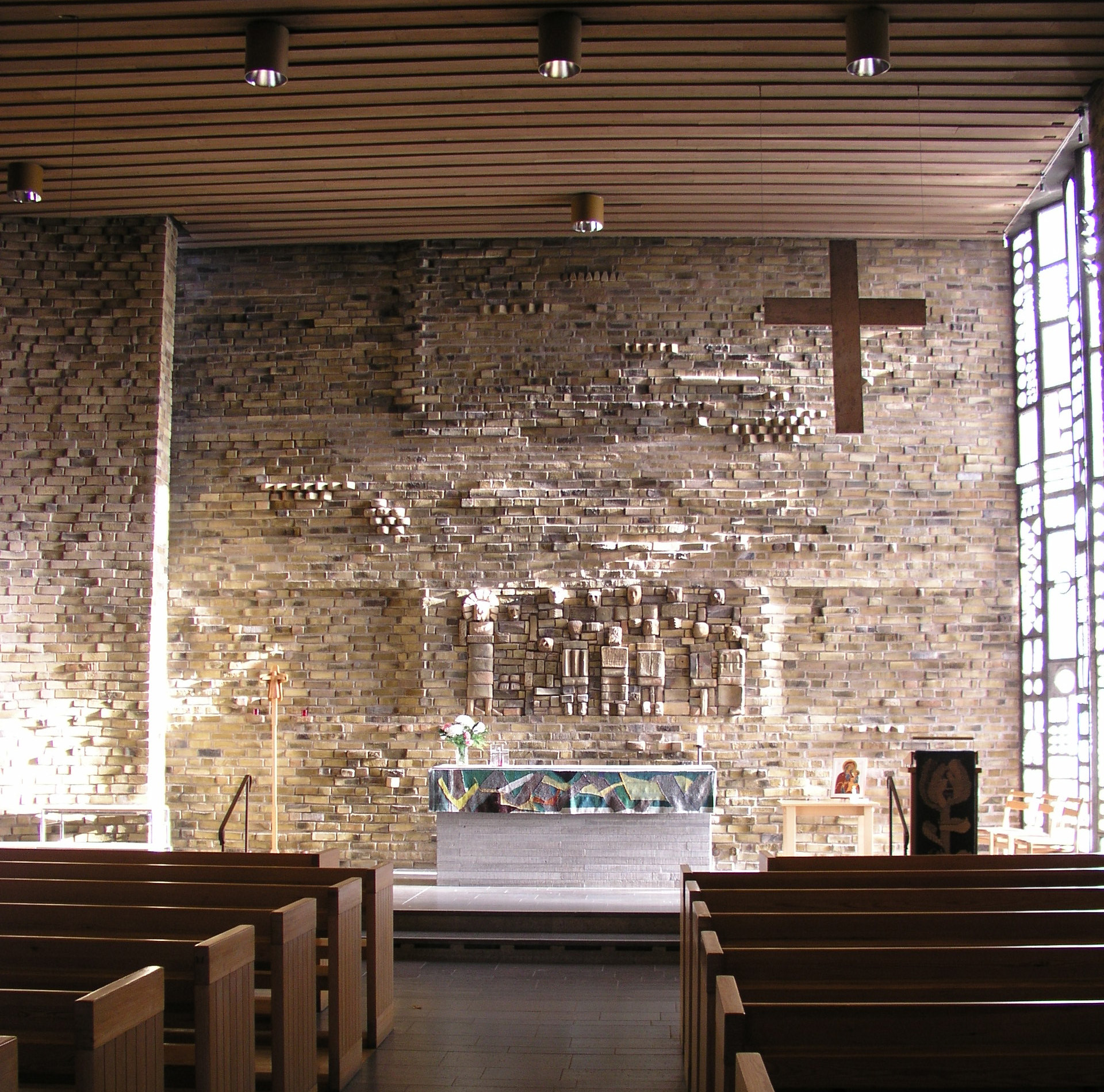 Kyrkan har en omslutande, rund form som bryter mot den omgivande kantigheten och allt från den inre tegelmuren till textilierna utgör en starkt sammanhållen helhet.