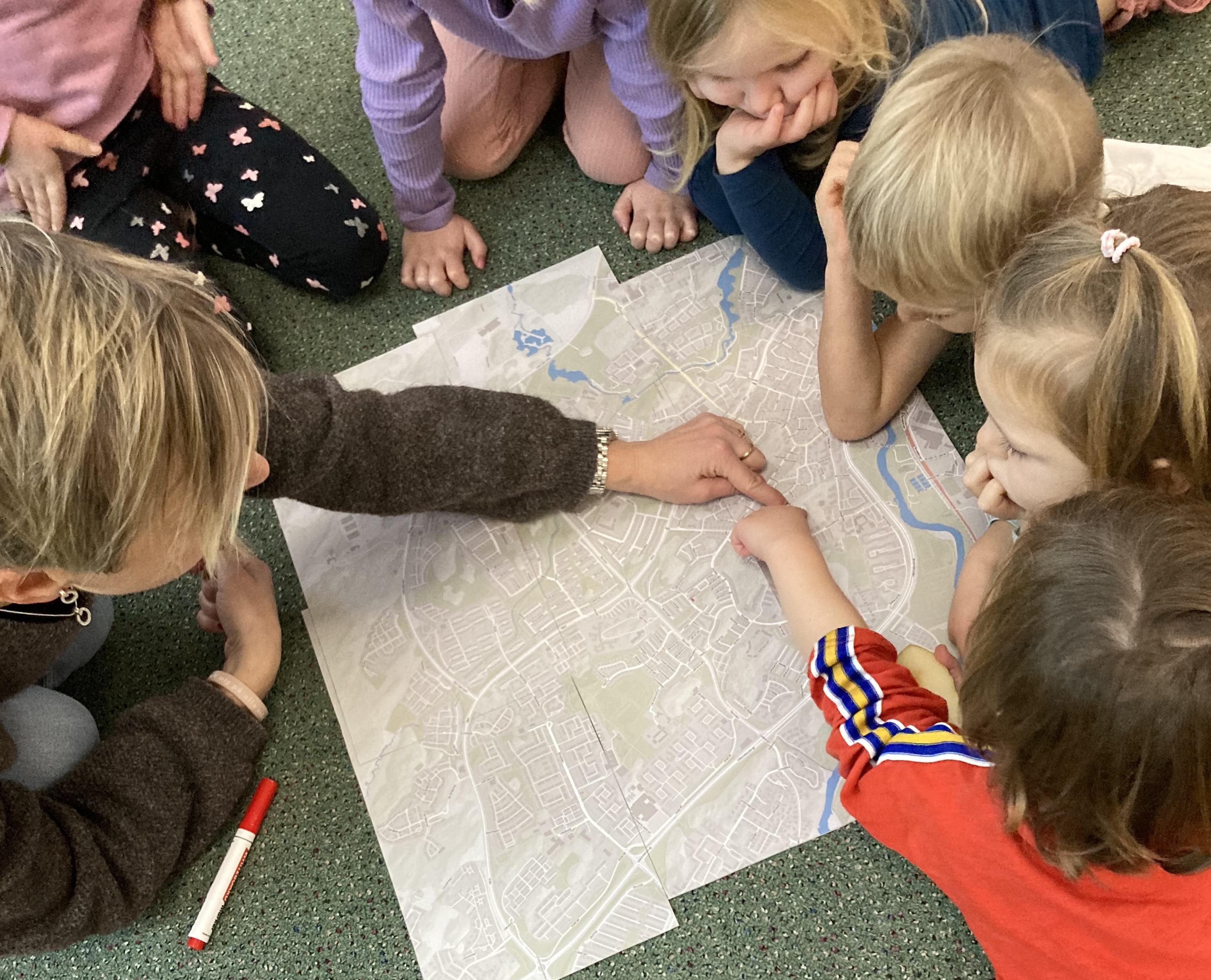 På en karta över närområdet har barnen fått hitta förskolan och sina egna hus. Några kunde sin adress och vilket nummer det var på huset, medan andra fick ta reda på det tillsammans med vårdnadshavare eller pedagog. I gruppen blev det en upptäckt att se hur olika långt alla har för att komma till förskolan. Någon har lång väg medan en annan bor nästan granne med Himlaliv. För några barn blev det även en upptäckt att deras egna hus låg nära varandra. Vi har förstått genom flera vårdnadshavare att det har frågats efter adresser och kartor hemma och att det blivit samtal om hur långt det är till olika släktingar och vänner.
