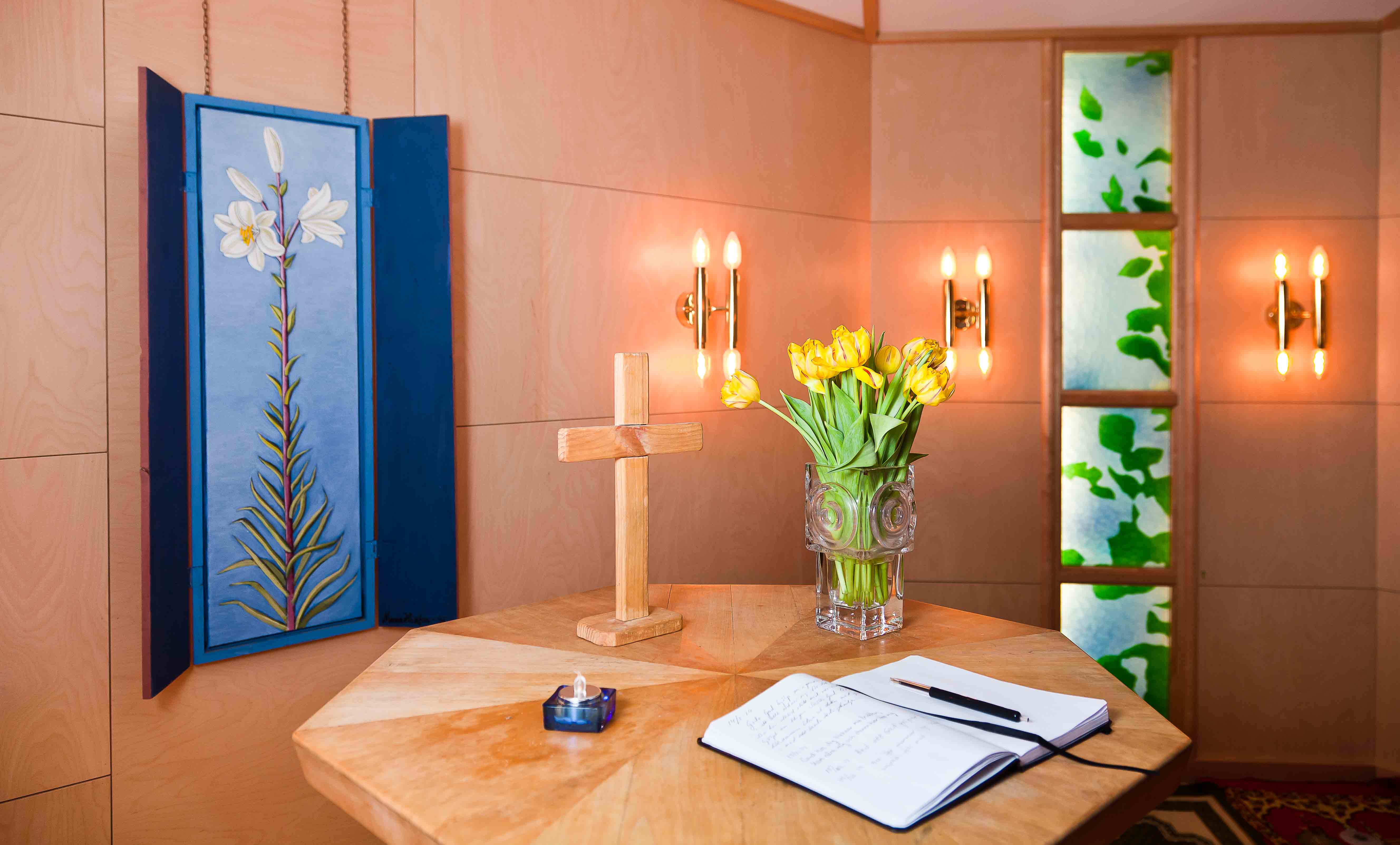På bordet vid ingången finns en korg. Där kan du lägga din förbönslapp. Vi som arbetar i Sjukhuskyrkan läser din lapp och ber med och för dig.