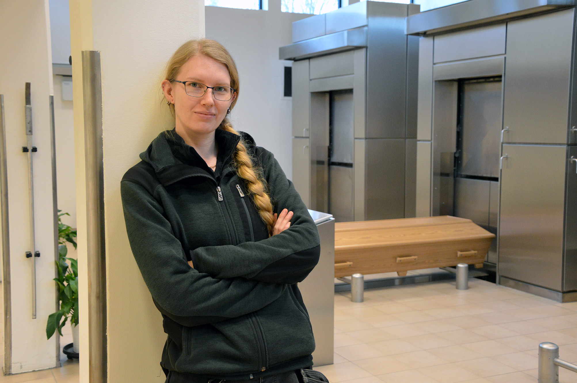 Hon är lång, har det blonda håret i en tjock fläta, och utstrålar en naturlig pondus när hon visar runt i krematoriets olika delar. Miljön är ljus, kakel och rostfritt dominerar och här och där står gröna växter.