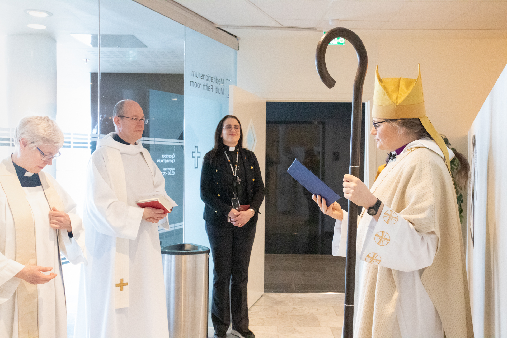 Vart är ni på väg? Vad är det som har hänt? Biskopen utgick i sitt invigningstal från frågorna som Jesus ställer till sina lärljungar. Själavårdande frågor som är viktiga ännu idag, på en flygplats, både för resenärer och dem som har sin arbetsplats där.