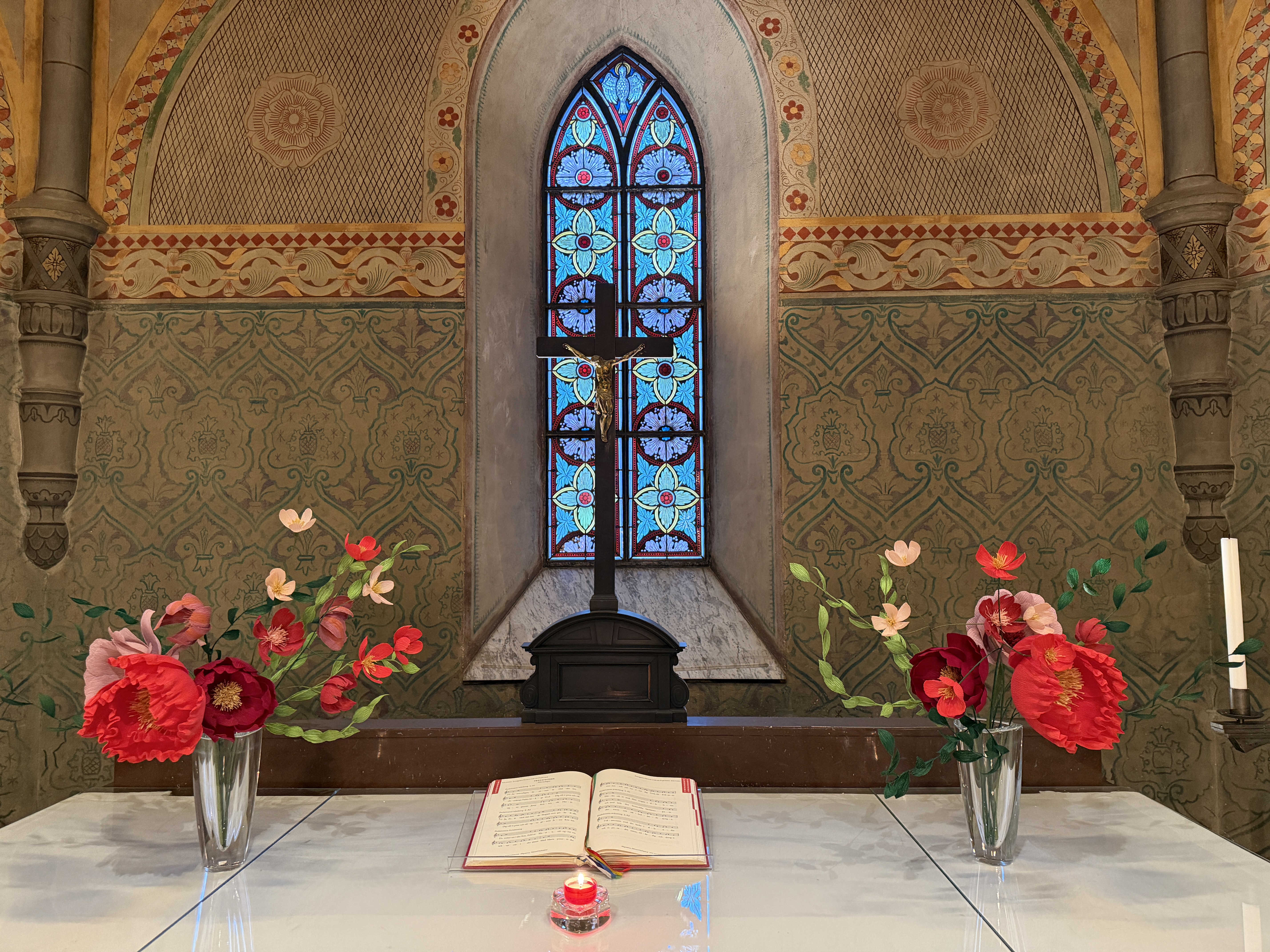 I Nacka kyrka har vi valt pappersblommor skapade av konstnären Hanna Nyman, Back to Poetry, som har sin ateljé i Gustavsberg, ett perfekt sätt att stötta lokala talanger. Pappersblommor är inte bara ett miljömedvetet val varje blomma är ett konsthantverk med liv och uttryck, skapad med omsorg, precis som naturens egna blommor. På så sätt kan vi fortsätta fira gudstjänst med skönhet och tacksamhet över skapelsen, samtidigt som vi tar ansvar för den.