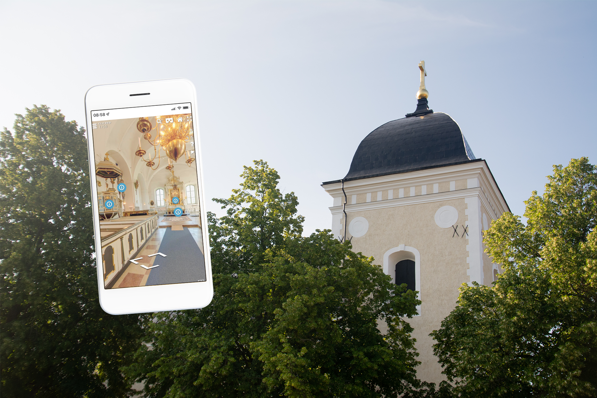 Det går också att komma åt guiderna via appen Kyrkguiden. Ladda ner appen, gå in på den kyrka du vill se och välj alternativet ”panorama.” Mer om hur du laddar ner appen kan du läsa i puffen som ligger längst ner på denna sida.