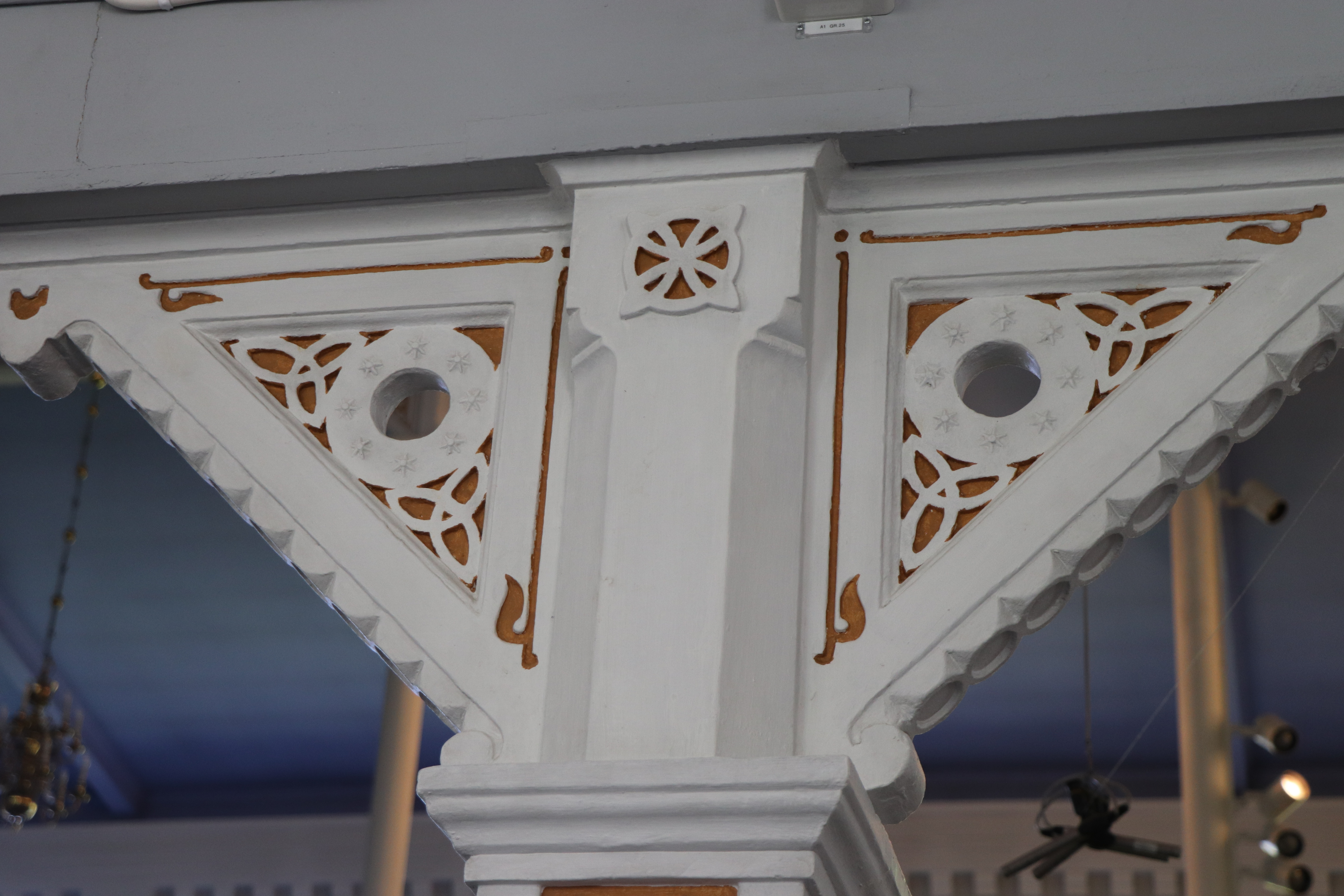 Takkronorna som hänger över läktarbariären är från 1941 och de som hänger under läktarna är från 1970 och är tillverkade av E Johansson Gelbgjuteri, Skara.