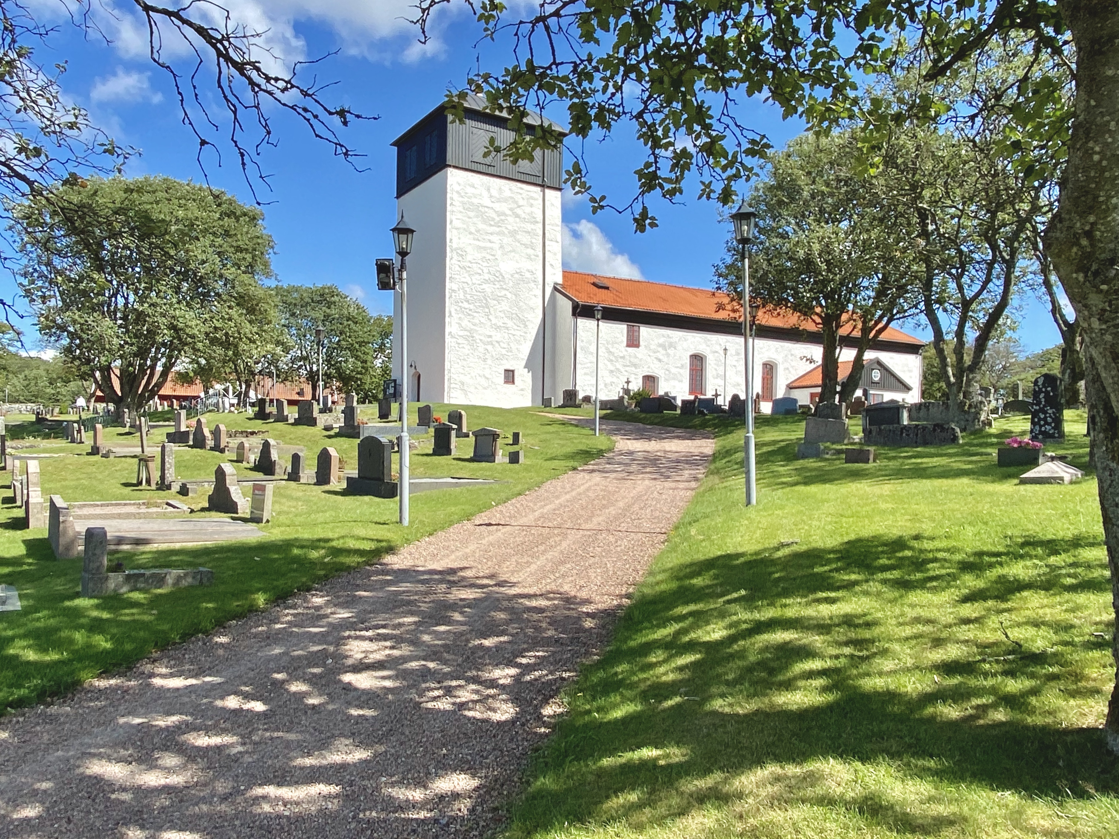 På väg ner till Mollösund ligger denna vackra träkyrka. Kyrkorummet är ljust och går i ljusa ockragula toner.