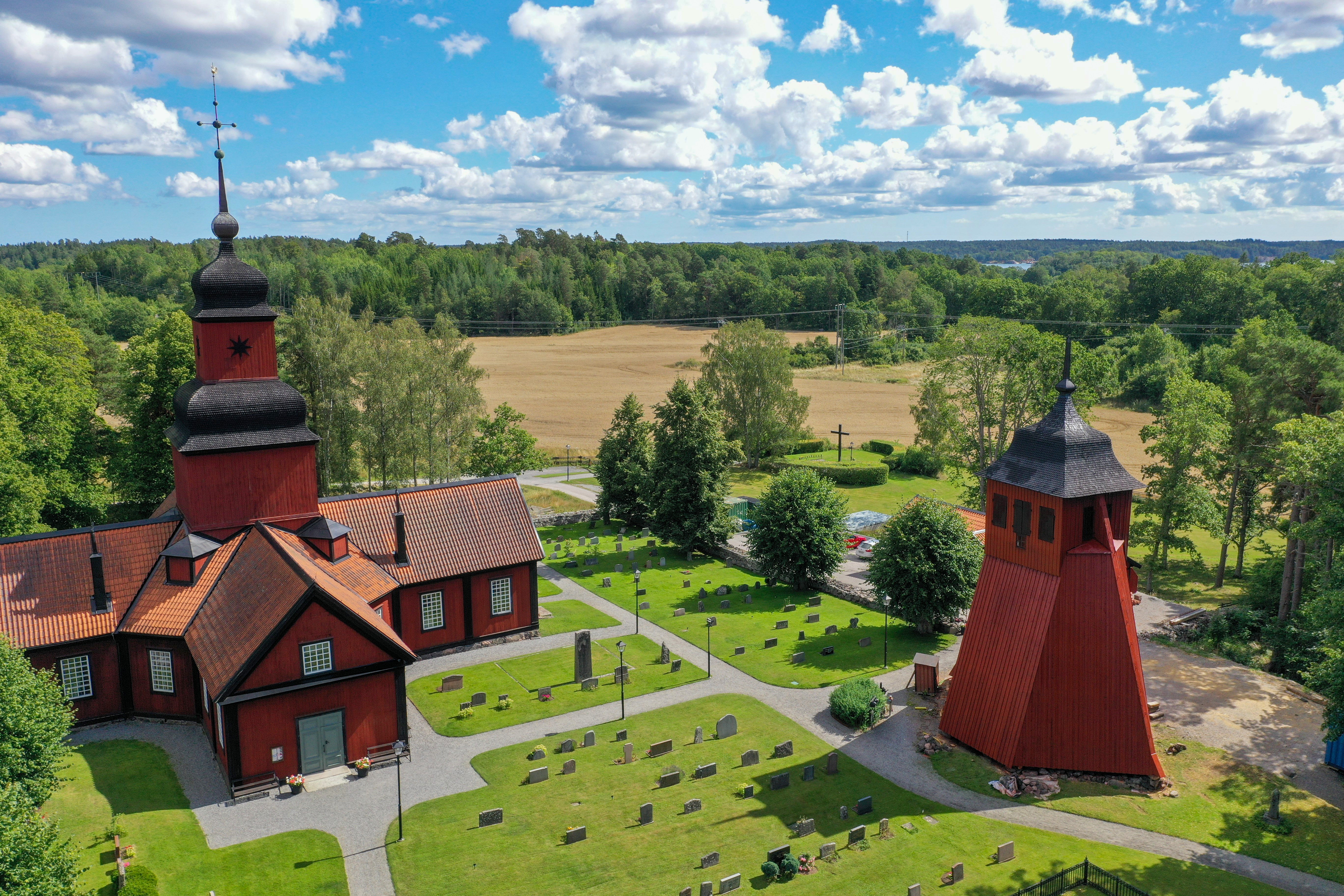 Nu pågår det stora arbetet med att byta ut timmer i form av strävor, syllar och klockbockar i Roslags-Kulla klockstapel. Det finns ganska mycket rötskador närmast muren och därmed arbetar vi även med dränering och ventilation så att inte samma skador uppkommer igen. Parallellt kommer det snart även att arbetas med tornhuven som lyftes ned. Där sker reparationer på spiran, hjärtstocken, lökkupolen och spånet.
