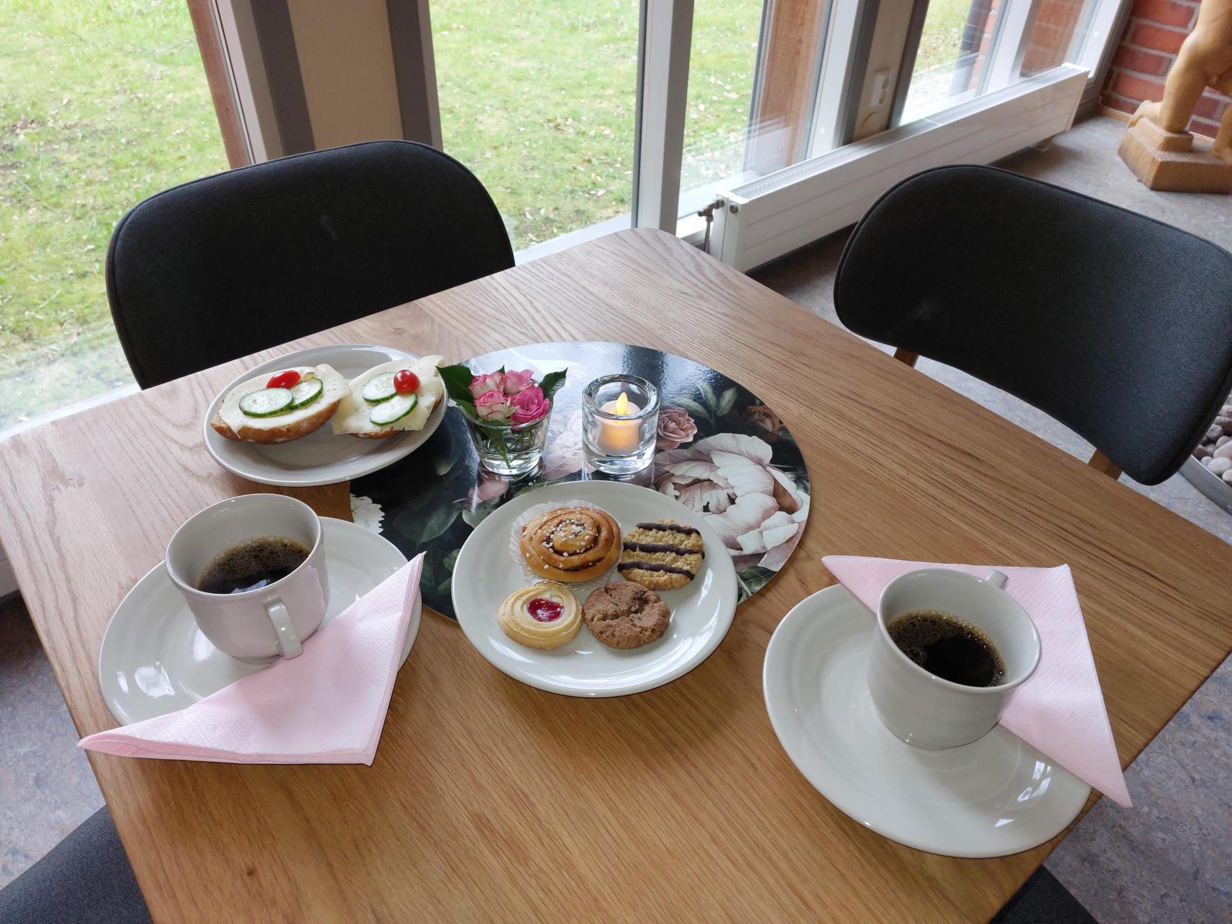 Vi serverar kaffe, te, saft, smörgås, bulle och kaka.