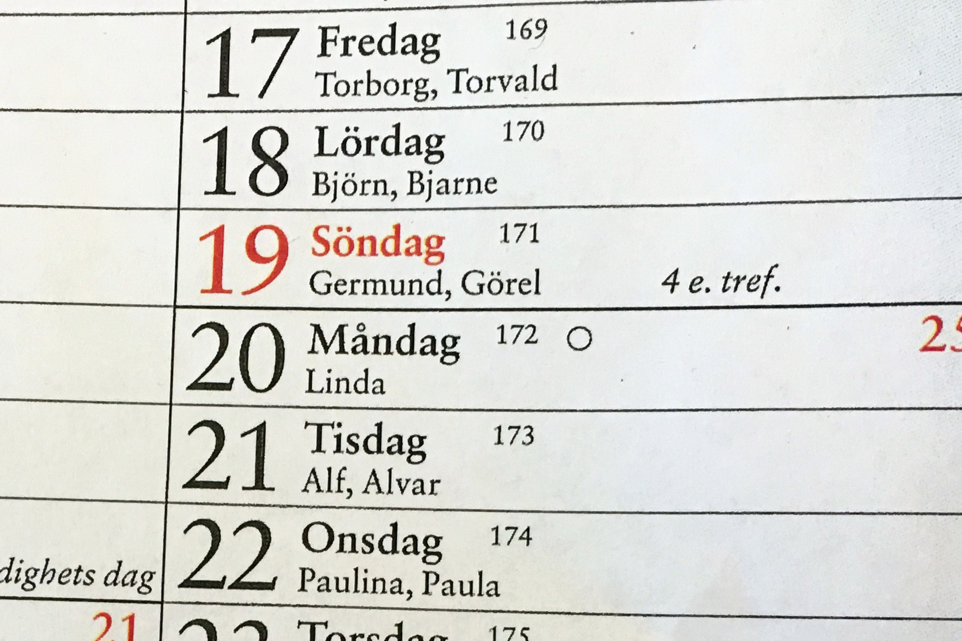 Om ni någon gång har läst de små röda siffrorna och bokstäverna bredvid, eller under, datumet på söndagsbladet i en almanacka så har ni kanske undrat vad ”4 e. tref.” egentligen betyder? Eller ”Joh. Döp. d”? Eller ”Tacks.d”? Eller något annat lika kryptiskt? Jo, kära vänner, då har vi genom att bara läsa en almanacka oförskyllt hamnat i kyrkans environger igen. Och kyrkan är ju lite eljest (som man lär säga i norrland) så där håller man sig med en egen almanacka, till och med ett eget år, finurligt nog kallat ”Kyrkoåret”.