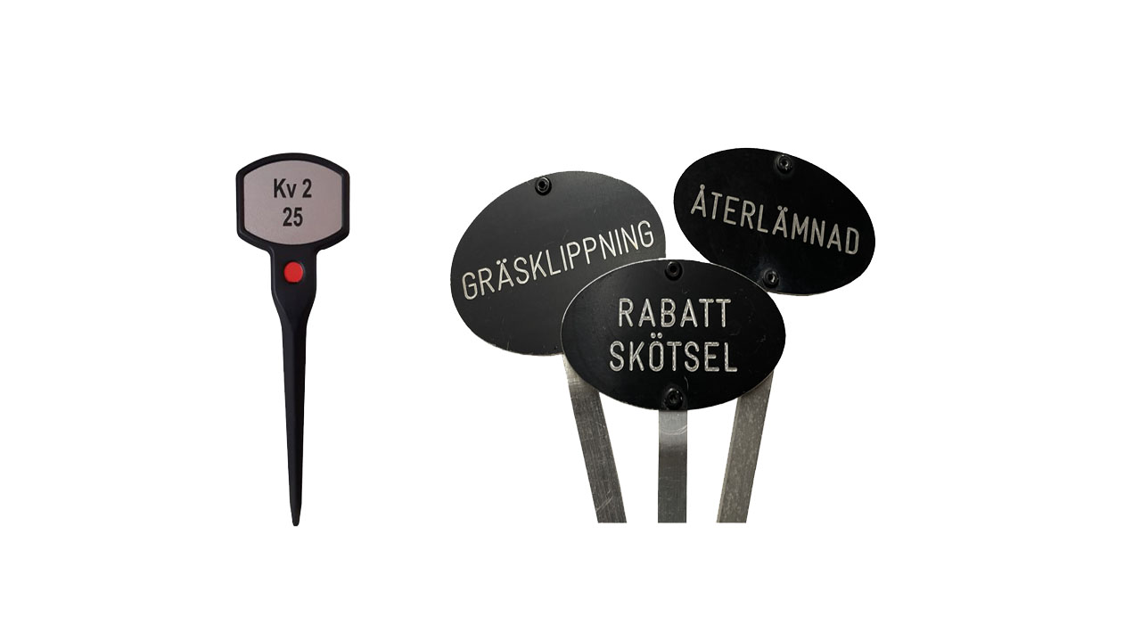 Svarta metallskyltar visar ifall gravplatsen har en tjänst: