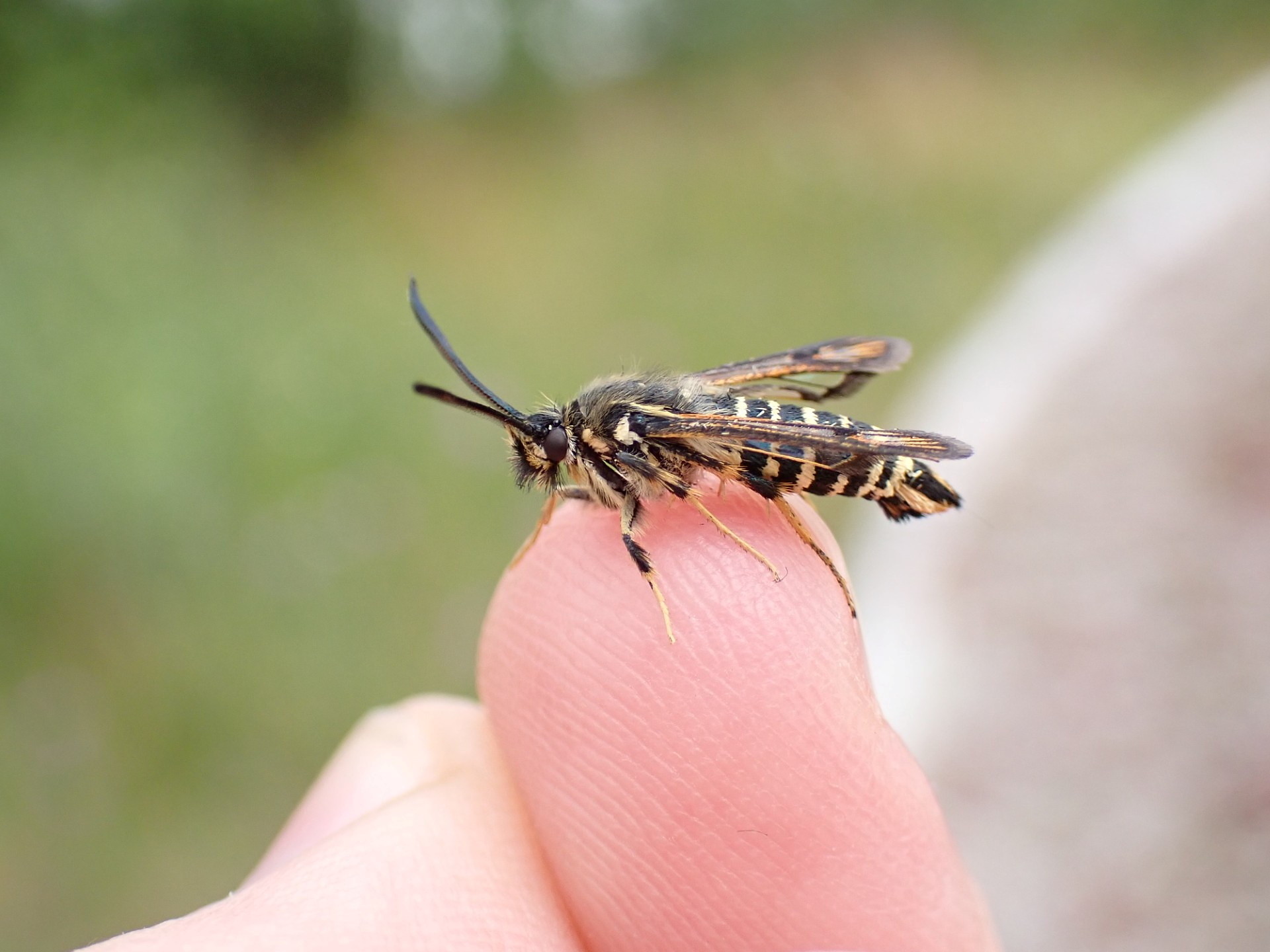 Den har klara framvingar med rödbruna spetsar, mörka kanter och en mörk bakkropp med gula band.