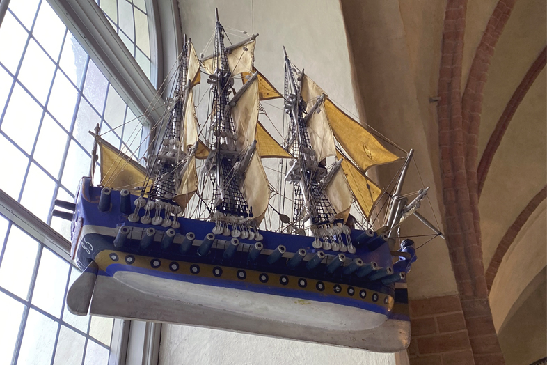 Överlevande från skeppsbrott skänkte ofta en modell till kyrkan som tack för att de undkommit katastrofen. Vårt votivskepp är från 1785.