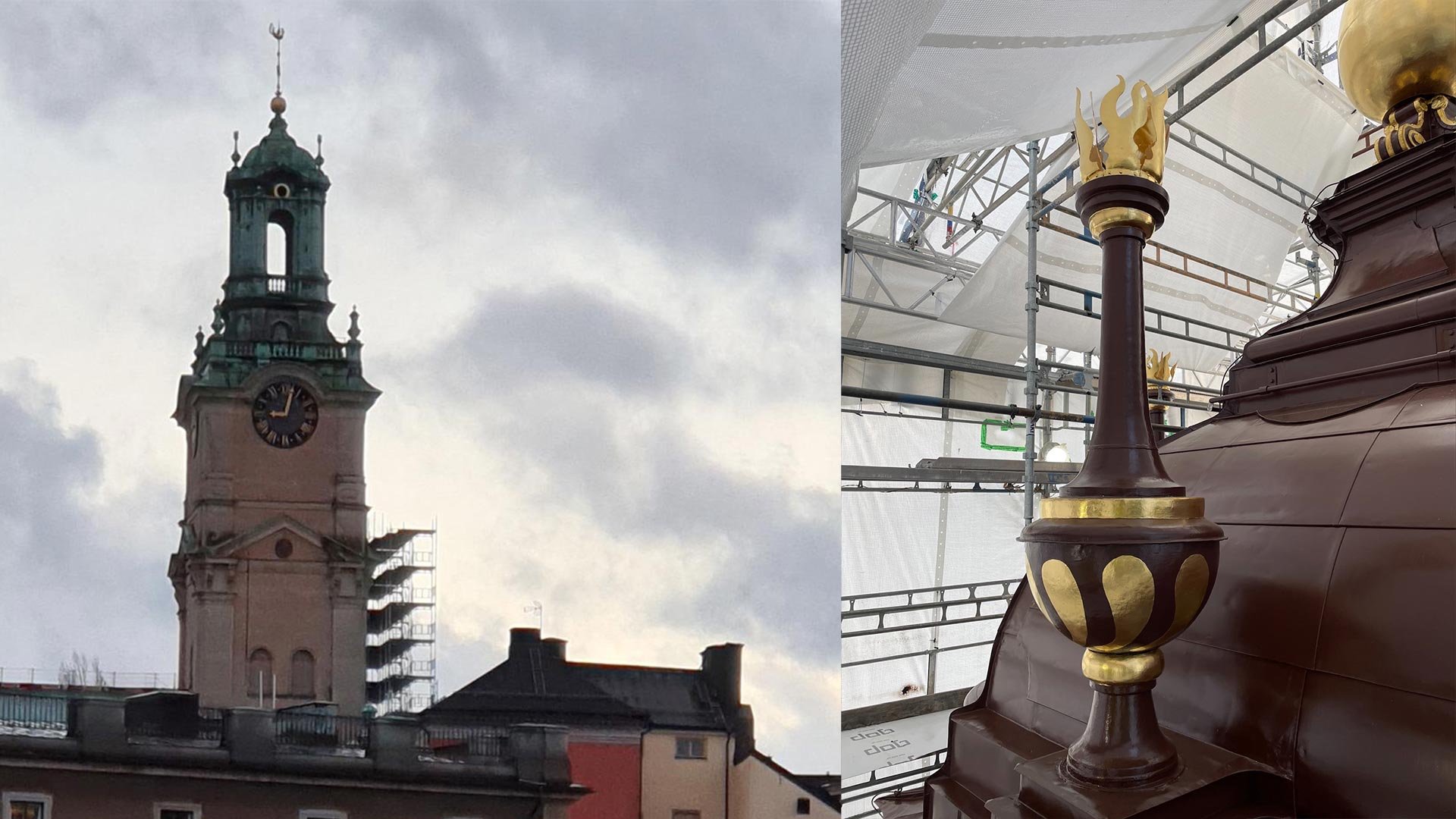 I nära två år har tornet varit inslaget i byggställningar och väv, osynligt för stockholmarna. Men nu, torsdag och fredag avtäcks lanterninen och den ny-förgyllda kyrktuppen blickar återigen ut över staden. Den djupröda lanternin (torntoppen) med dess guldinslag och ljust varmrosa putsade tornsidor