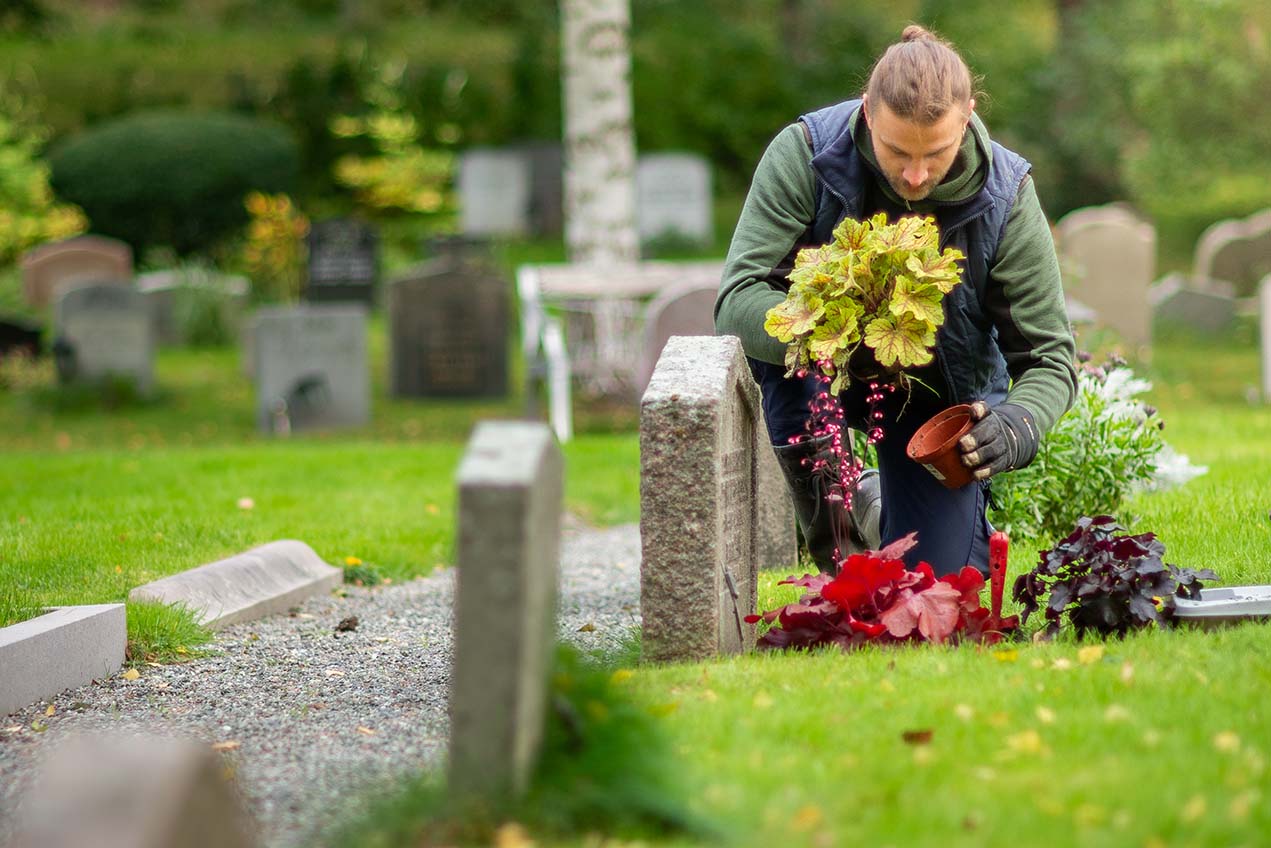 Du sköter planteringsytan själv. Om du inte vill ha någon planteringsyta kan vi så gräs över hela gravytan. Kontakta oss i så fall.