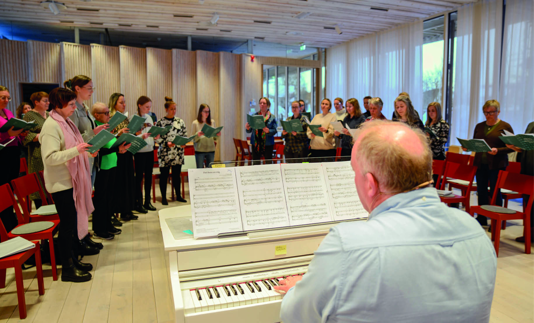 – Den har varit med i Melodifestivalen, berättar han och får snabbt motfrågan "Var jag född då?" av de yngre körsångarna. Efter en snabb googling konstaterar stolsgrannen skrattande att det var 2018 och övningen kan fortsätta.