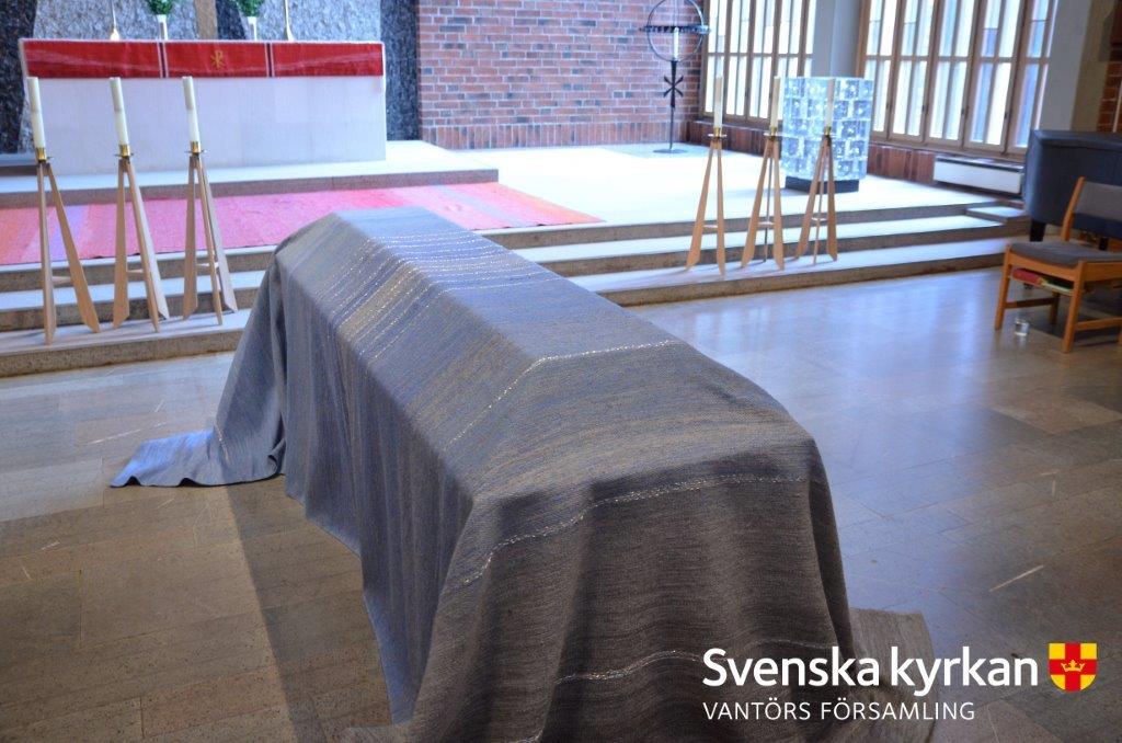 Bårtäcket i Vantörs församling är ljusblått med vackra silvertrådar invävda i tyget.