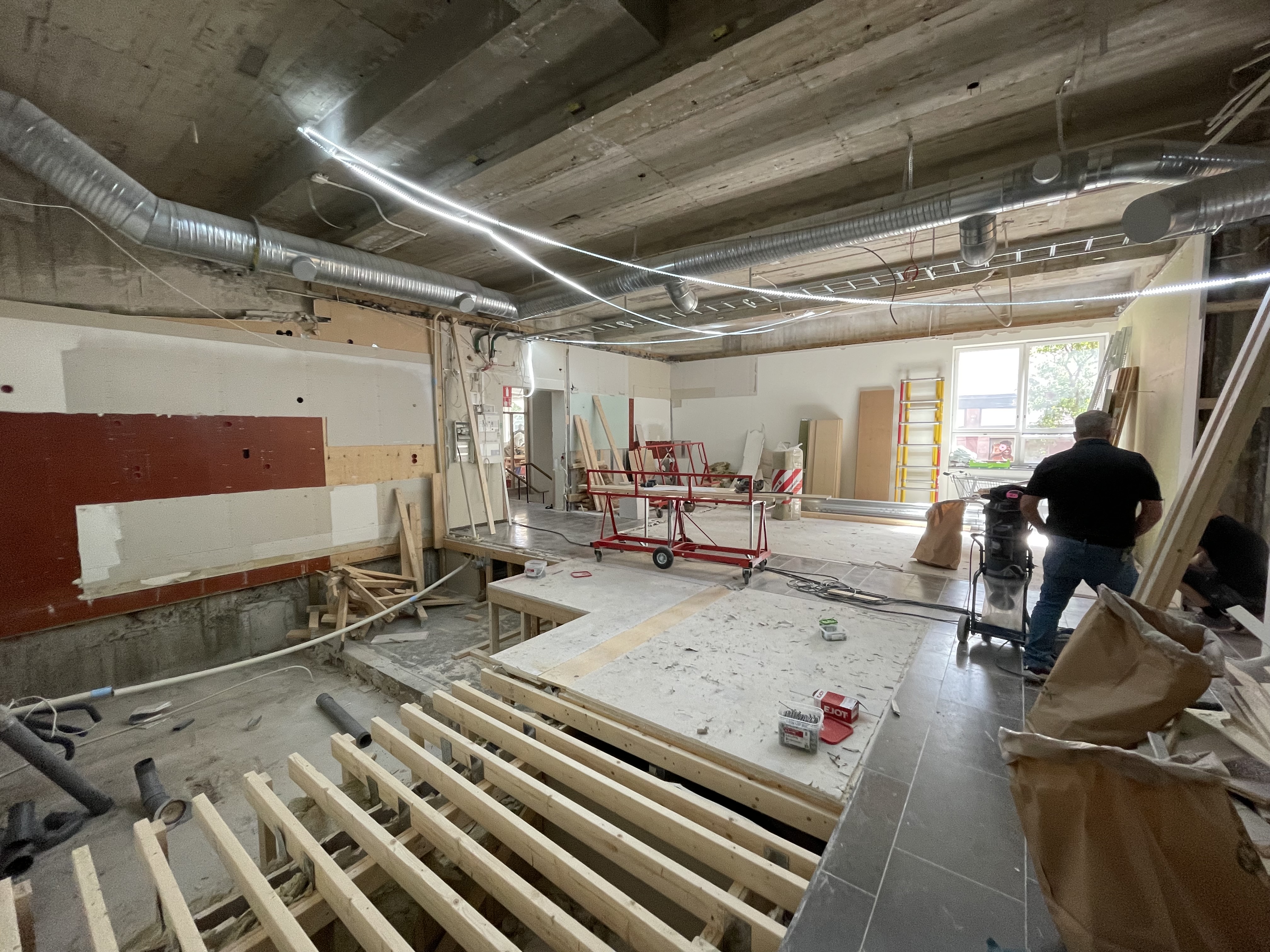 Efter cirka två månaders arbete så har det mesta rivits ut från de tidigare lokalerna. Mellanväggar av gips och tegel, undertak samt delar av golvet är borta.